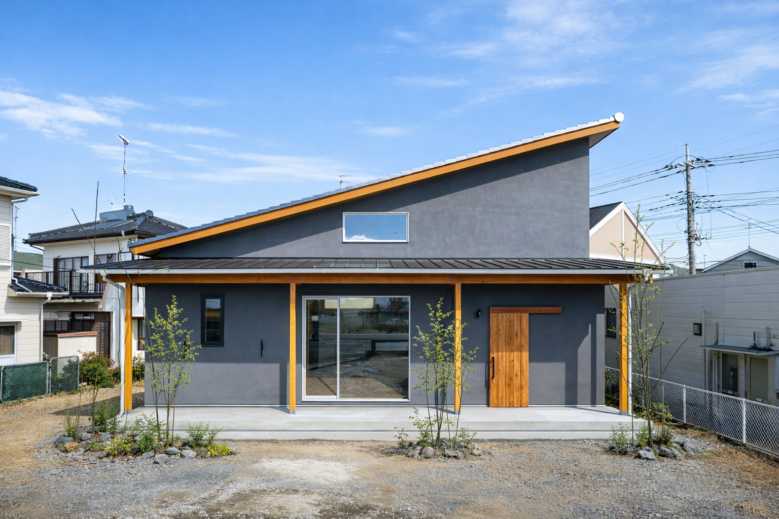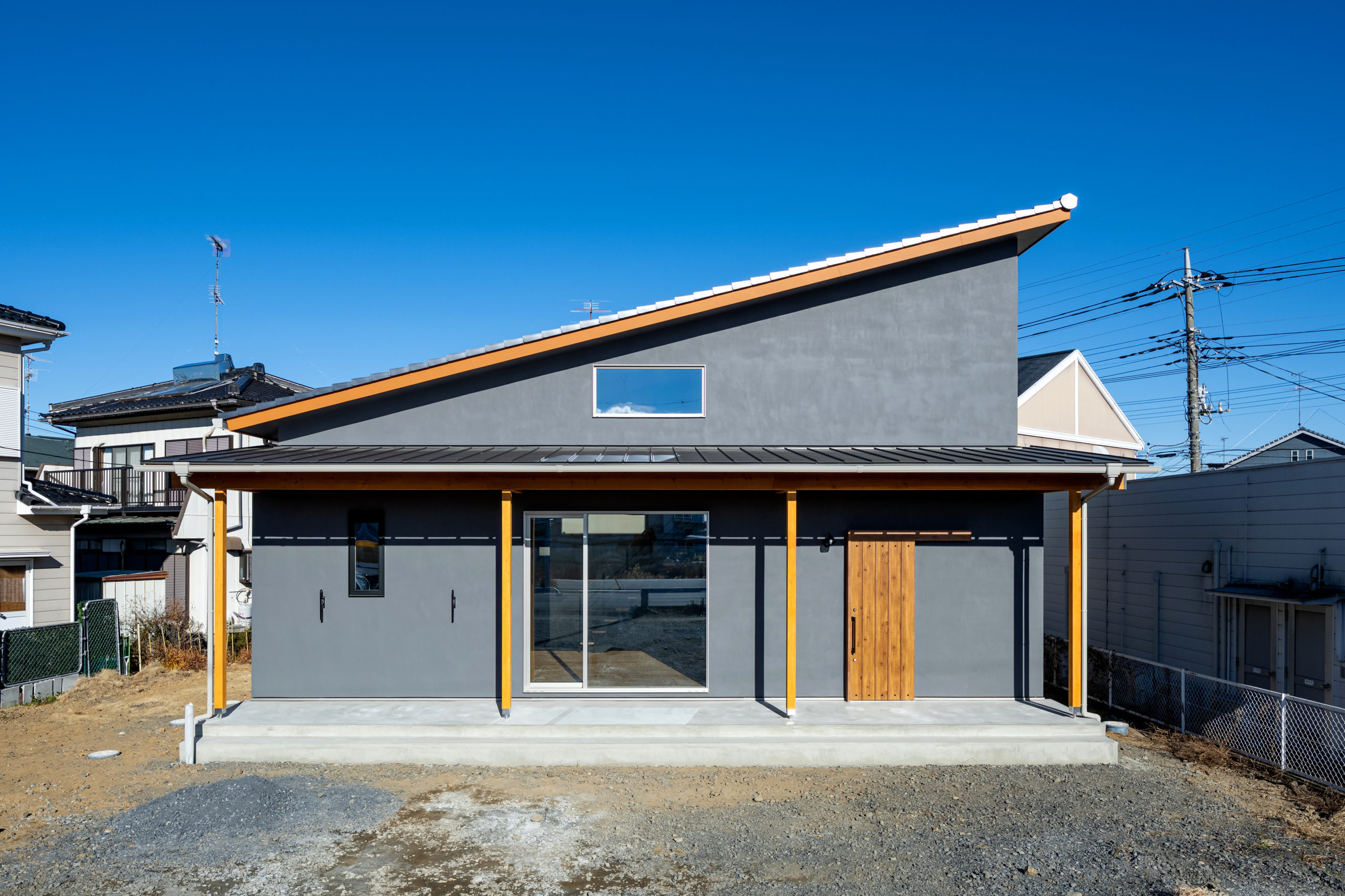片流れのグレー外壁とカバードポーチの家