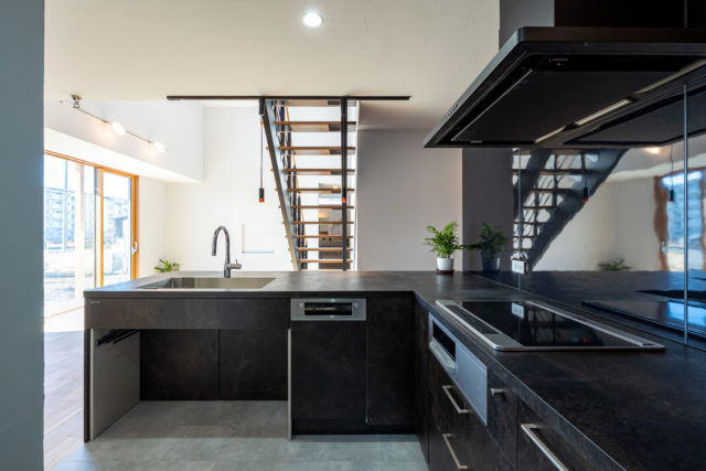 家具のように美しい『グラフテクト』のキッチン。この一邸のために計算し尽くされたレイアウトは、ストリップ階段や吹き抜けと調和し、住まいの核となる存在感を放ちます。大手メーカーの画一的な設備では満足できなかった施主様が、機能とデザインを突き詰め、自由設計で叶えたこだわりのステージです。
