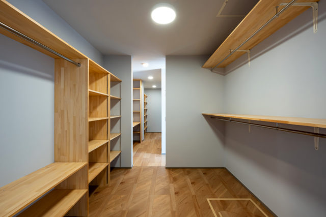 パントリーからファミリークローク、そして水回りへと一直線に結ばれた家事動線。忙しい共働き世代のご夫婦が最もこだわった「家事をスムーズにする」ための設計です。大手メーカーの規格では難しい、生活スタイルに合わせたミリ単位の棚配置や回遊性を実現。日々の暮らしを軽やかに整える、機能美あふれる空間です。