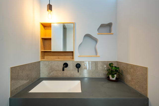 施主様が現場の壁に直接描いたラインを、そのまま職人が形にした「雲形ニッチ」が主役の洗面台。既製品やルールに縛られる大手メーカーでは実現できない、自由設計の醍醐味が凝縮された空間です。彩度の異なる漆喰壁の柔らかな質感と、世界に一つだけの遊び心が融合。毎朝の身支度が、作り手との思い出と共に愉しくなる、愛着あふれる一角に仕上がりました。